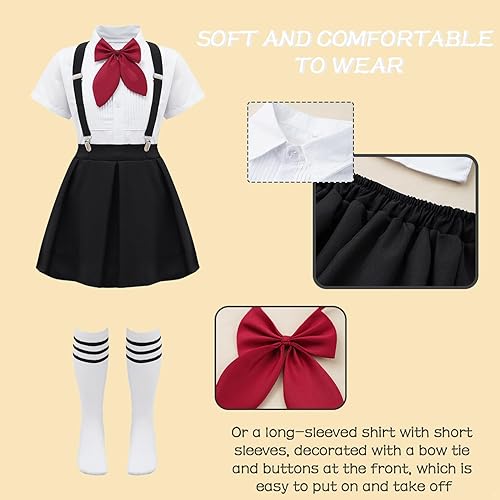 JEATHA School Girls Uniform Suit Formal Bow Tie Dress Shirts Tops with Mini Pleated Skirts Suspender Socks Set(Ype B Black,7-8 Years)