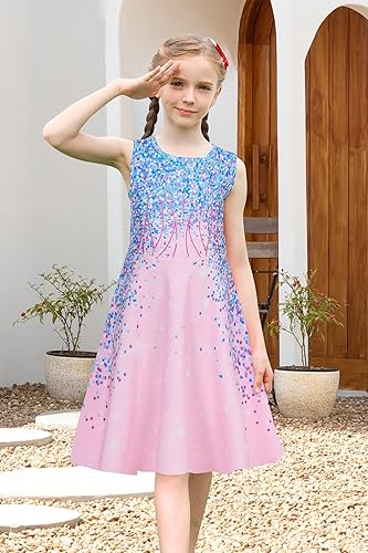 uideazone Girls Sleeveless Dress Round Neck Floral Printed Sundress for Casual Home Party Beach 4-12 Years(Pink,6-7 Years)