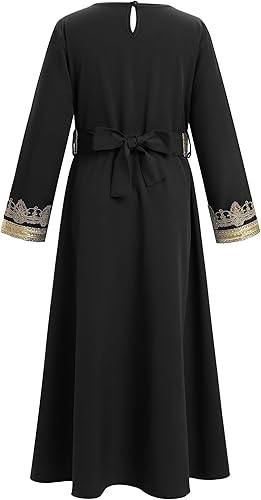Muslim Dress for Kids Girls Abaya Middle East Ramadan Long Sleeve Lace Prayer Dress Arabic Kaftan with Belt(Black,10-11 Years)