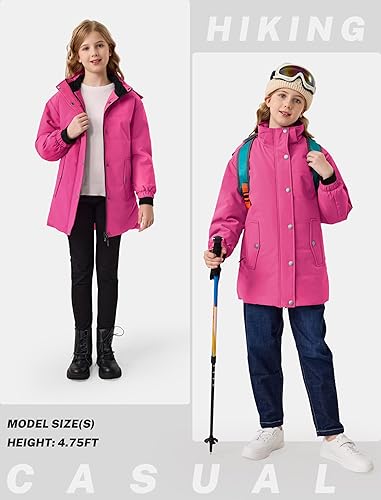 MoFiz Girls Warm Long Jacket Coat with Hood Kids Water-Resistant Fleece Lined Winter Outdoor Outwear Windbreaker with Pockets(Rose Red,Small)