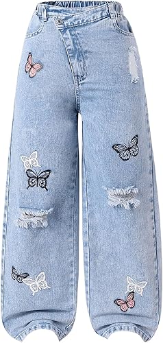Feature: Butterfly print, ripped, wide leg, asymmetrical waist, elastic high waist, y2k streetwear jeans