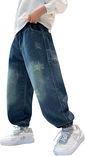Kids Baggy Washed Jeans Casual Elastic Waist Loose Joggers Denim Pants with Pockets for Girls Boys 5-15 Years