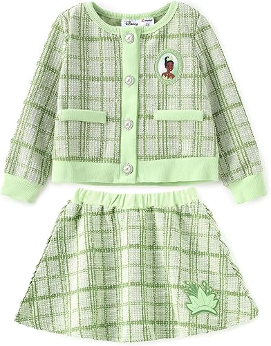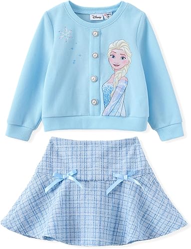 Elegant 2-Piece Design: This cozy Disney skirt set includes a knit top featuring a bold Elsa graphic, pearl-style buttons, and delicate snowflake accents. It’s paired with a classic plaid skirt made from tweed-style fabric, combining warmth, texture, and timeless style for fall and winter wear