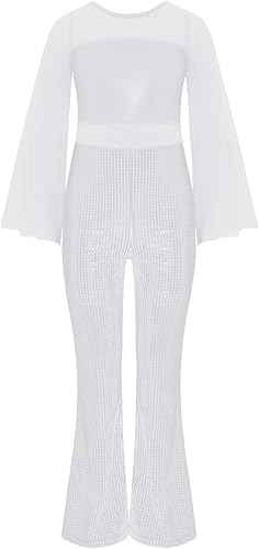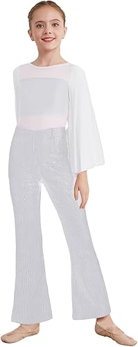 FEESHOW Girls Metallic Plaid Mesh Splice Dance Unitard Long Flared Sleeve Bell Bottom Jumpsuit Full Body Disco Romper Silver 6 Years