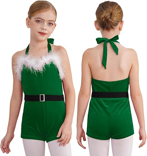 A Christmas Santa Claus shorts jumpsuit with belt for girls, designed with halter neck, sleeveless and open back