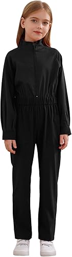 JEATHA Kids Girls Coveralls One Piece Solid Color Full Body Jumpsuit Long Sleeve Zipper Overalls with Pockets(Navy Blue,10 Years)