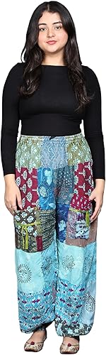 Exotic India Girl's Elastic Waist Pants Loose Pure Cotton Long Trousers with Printed Patchwork Pant for Girls Crystal Blue