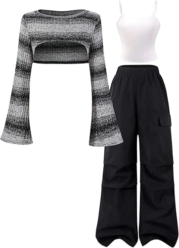 Features: Girls clothes, girls' clothing sets, 3 piece set, cami top and wide leg pants with bell sleeve gradient crop top set, casual street style, fall outfits for girls