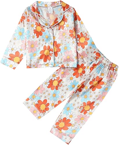 Design:The pjs for girls,kid's sleepwear,little girl pajamas satin pajamas,baby holiday pajamas,toddler girl pajamas,lapel neck,contrasting trim,fuzzy trim pajamas,long sleeve sleep shirts,turn-down collar,silk flowers,cute bow/floral/cherry/flower/strawberry print,button down shirts,daisy or stripe pattern,front chest pocket,matches with elastic waist pj pants,silk pjs for girls,solid color pajamas,loose fit,toddler girl fall pajamas,two piece pajamas for boys girls,making your kids feel relax