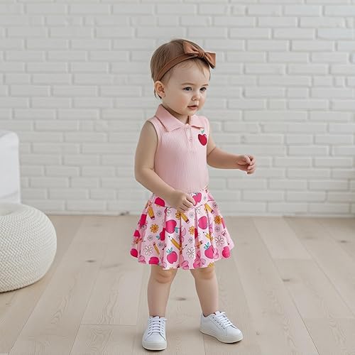 Design: Cute stylish kindergarten outfits for toddler girls; Baby girl ribbed tank top with apple embroidery, sleeveless, button detail and lapel neck design; Baby girl pleated a-line skirt with elastic waist and pencil & floral print for easy fit; Your baby will feel comfortable and cool in summer