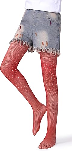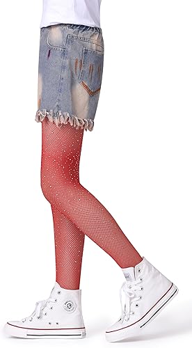 Henwarry Girls Sparkle Fishnet Stockings Children's High Waist Tights Rhinestone Hollow Out Party Pantyhose(A03-red,7-12 Years)