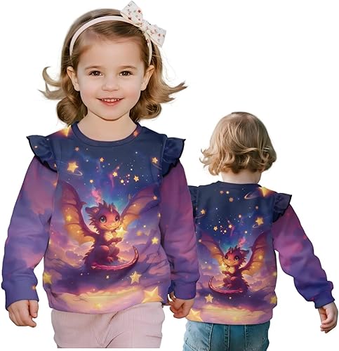 Girls Ruffle Long Sleeve Sweatshirts Relaxed Kid Sweatshirt 1-8 Casual Versatile Pullover Active Wear Sports Top(Cute Dinosaur,3-4T)