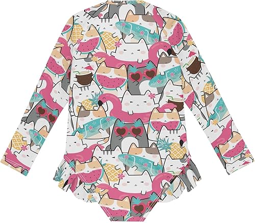 QUGRL Girls Rash Guard Long Sleeve One Piece Swimsuits Kawaii Cute Cats Zipper Girl Bathing Suits Size 9-10 Colorful Summer UV Swimwear Stand Collar