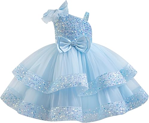 Pageant Dress for Girls: Toddler baby girl birthday party dress, asymmetric neckline top bodice, one elastic strap, sparkly sequins on the front, adds a stylish and striking touch under the light. Featured a bow tie with imitation pearls on the right shoulder and waist, the dress look super cute and noble by this detail. Invisible zipper with self-tied sashes at back, allow for a customized ease and fit to different body shapes.
