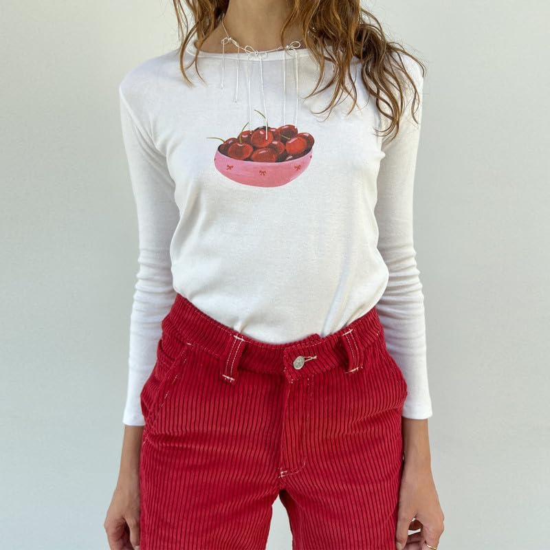 Women Y2K Graphic T-Shirt Ribbed Long Sleeve Crop Top Fairy Grunge Aesthetic Going Out Clothes(C-00- Cherry,Large)