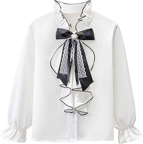 Girls Bowknot Neck Button Down Shirt Pearl Decor Ruffle Long Sleeve Lapel Collar Blouse School Uniform Tops for 3-13 Years(01 White,12 Years)
