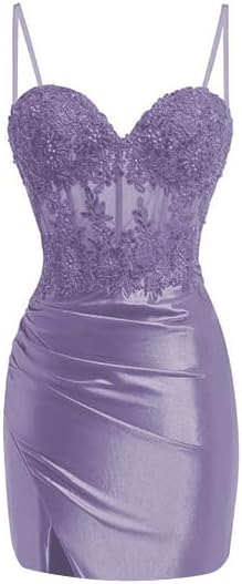 Design: Corset Homecoming Dresses for Teens Spaghetti Straps Cute Dress for Girls Sweetheart Prom Dresses for Women Sheath Cocktail Dresses Dusty Purple Satin Party Gowns Short Lace Applique Mini Ball Gown with Slit