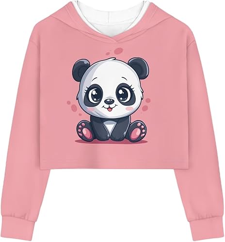 Kids Girls Crop Top Hoodie Sweaishirt Long Sleeve Pullover Shirt Sport Dance Top Age 5-14(Cute Panda,13-14 Years)