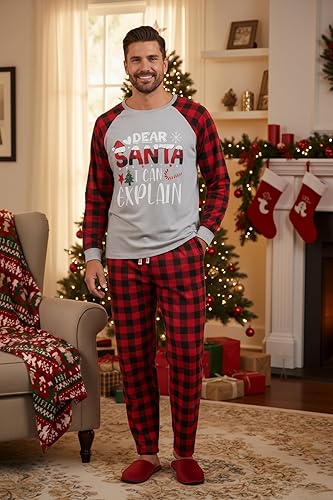 IFFEI Matching Family Pajamas Sets Christmas PJ's with Letter and Plaid Printed Long Sleeve Tee and Bottom Loungewear(Red-grey,Large,Men)