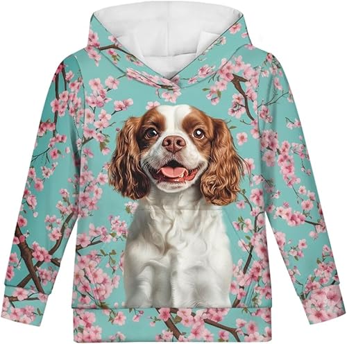 WELLFLYHOM Youth Kids Hoodies for Teens Girls with Pockets Boys Pullover Hooed Sweatshirt Long Sleeve Tops Age 6-16 Years Old(Cavalier King Charles Spaniel Dog Cherry Blossom,11-13 Years)