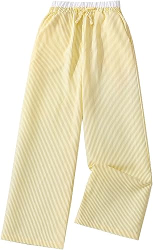 Teen Girls Wide Leg Straight Pants Joggers Striped Pants with Pockets Drawstring Trendy Elastic Waist Cute Trousers