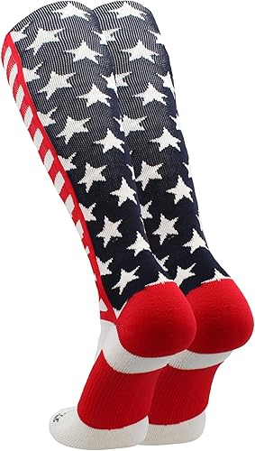 PATRIOTIC SOCKS: Show your USA Pride with these patriotic over the calf American Flag socks featuring stars and stripes. These red white and blue socks in size X-Small are ideal for softball, youth baseball, lacrosse, wrestling, field hockey, volleyball, soccer, football and more!
