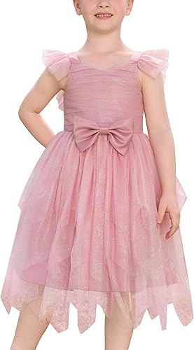 ADORABLE DESIGN - Super gorgeous formal dresses for girls. Sweetheart neckline cami dress, ruched mesh on the front bodice, a mesh bowknot on the each shoulder strap. High stretchy shirred back with self-tied sashes allow for a customized ease and fit to different body shapes. Fluffy handkerchief hem ruffle tulle skirt, including 4 layers of the skirt to add more fullness, 3 layers tulle with glitters and 1 layer lining, looks so pretty