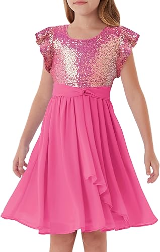 Dazzling Sequin Chiffon Design: Our girls' dress combines a glamorous sequined bodice with a flowing chiffon skirt, creating a stunning look perfect for special occasions. This dress effortlessly blends elegance with comfort, making it ideal for formal events or dance performances