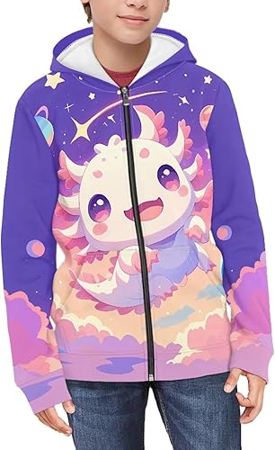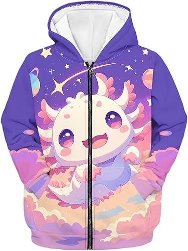Biyejit Kids Novelty 3D Graphic Printed Hooded Sweatshirt Boys Girls Zip Up Hoodies Age 6-16 Years(Axolotl Starry Planets,8-10 Years)