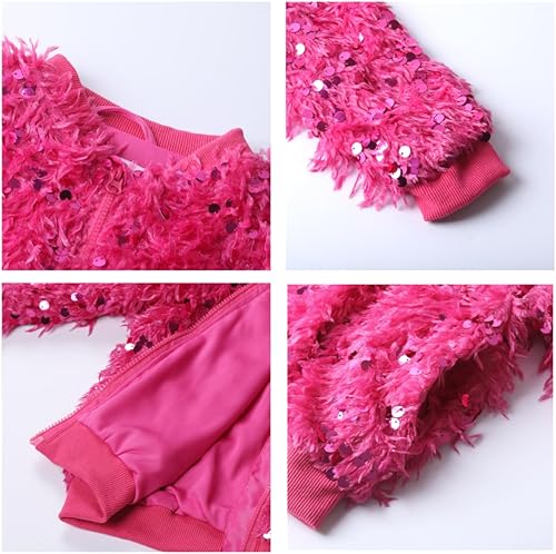 Girls Faux Feather Sequin Jacket Shiny Long Sleeve Zip Up Coat with Pockets 5-12Y(Hot Pink,10 Years)