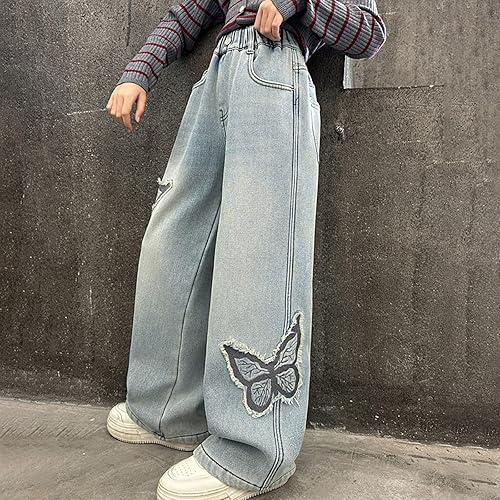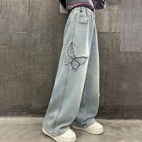 Girls Wide Leg Jeans Kids Asymmetric Butterfly Applique Distressed Denim Elastic Waist Cargo Trousers for 5-16 Years(Blue,11-12 Years)