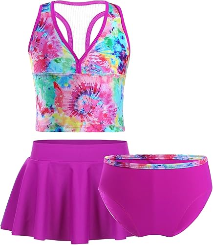 Matching bottoms and skirt with elastic waistband. Comfortable and breathable fabric, quick dry. Stylish swimwear for your girl
