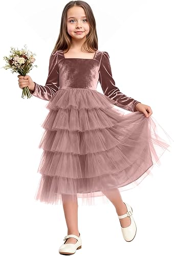 Design: Our girls formal bridesmaid dresses feature a square neckline that adds a touch of classic charm, long velvet sleeves for a cozy and stylish look, and a tiered tulle skirt that creates a playful, princess - like silhouette. The combination of the structured velvet top and the flowing tulle layers strikes a perfect balance between sophistication and whimsy, making the wedding party flower girl dress visually appealing and suitable for little ones