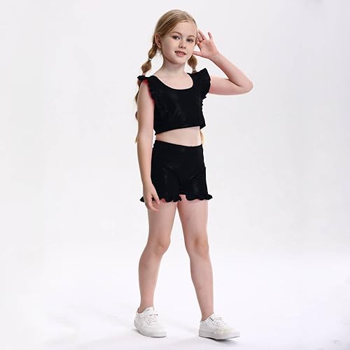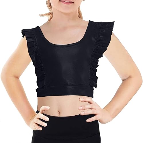 Girls Training Bra Cute Ruffle Sports Bra for Kids Scoop Neckline Fitness Yoga Bra Strap Crop Top(Bright Black,7-8 Years)