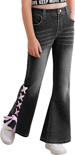 Oyolan Kids Girls Flared Jeans Bell Bottom Denim Pants Teens Skinny Lace Up Bow Side Y2K Denim Trousers with Pocket(Black,12 Years)