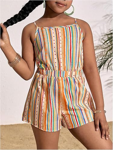 • Feature: Boho, striped, sleeveless, square neck, spaghetti strap, wide leg, shorts romper for girls