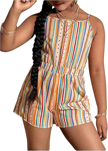 Feature: Boho, striped, sleeveless, square neck, spaghetti strap, wide leg, shorts romper for girls