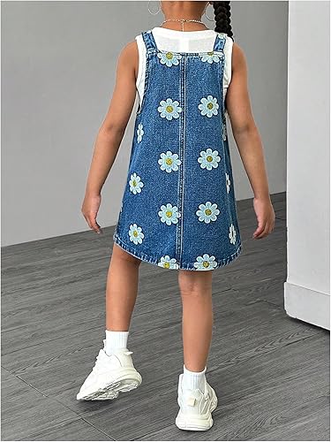 MakeMeChic Toddler Girl's Floral Denim Overalls Square Neck Sleeveless Summer Jean Pinafore Overalls Dress(Blue,7 Years)
