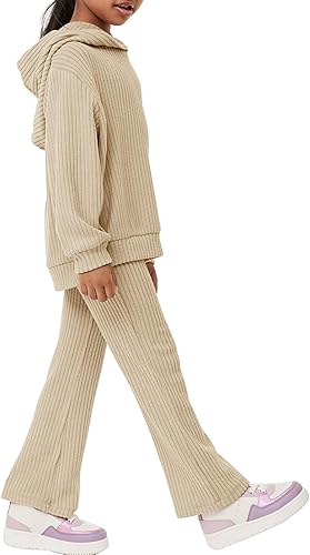 Feature: Two-piece outfits for Girls, Grils sweater set, ribbed knitwear, Solid color, Hoodie design, Long sleeve, High waisted, Flare pants, Slim fit, Stretchy, Casual Sweatsuits Set, sping summer Fall, and winter outfits, Warm, Soft and comfy.