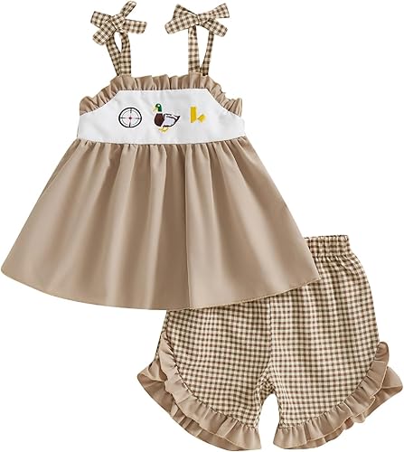 Kids Girls Summer Clothes Mallard Duck Tie-up Camisole and Ruffled Plaid Shorts Set Toddler Duck Hunting Outfit(Khaki,4-5T)