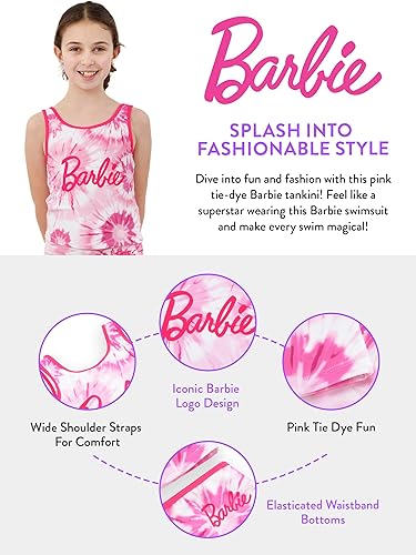 Fun And Fabulous Tie Dye Barbie Swimsuit: Dive into a world of fashion with this Barbie tankini two-piece set! Featuring a playful tie-dye design in shades of pink and white, it's the perfect splash of color for any Barbie fan's beach day.