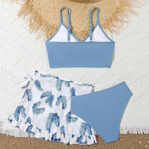 Girls Bikini Bathing Suits with Flower Wrap Skirts 3 Piece Kids Padded Beach Sport Swimsuits Briefs Summer Swim Sets(Blue,15-16 Years)