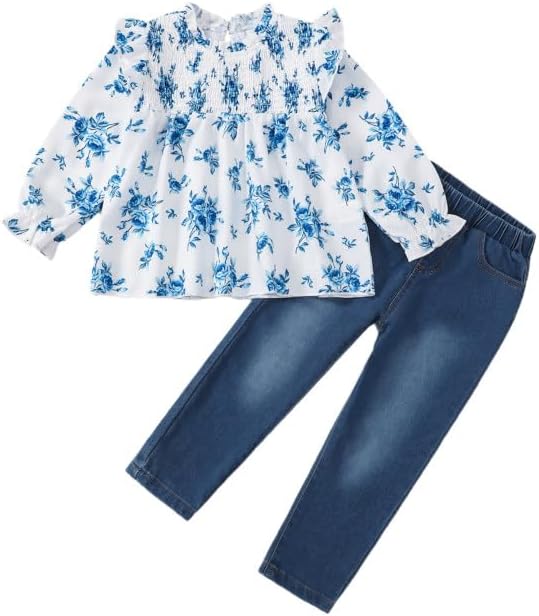 Package:2 piece outfits include 1 pieces cute long sleeve Ruffle crewneck tops, 1 pieces denim jean