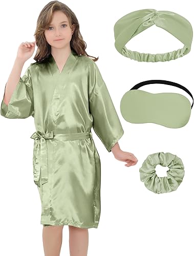 EPLAZA Kids Girls Satin Robe with Hair Band Eye Mask for Birthday Spa Bridal Party Flower Girls Wedding Robes Kimono