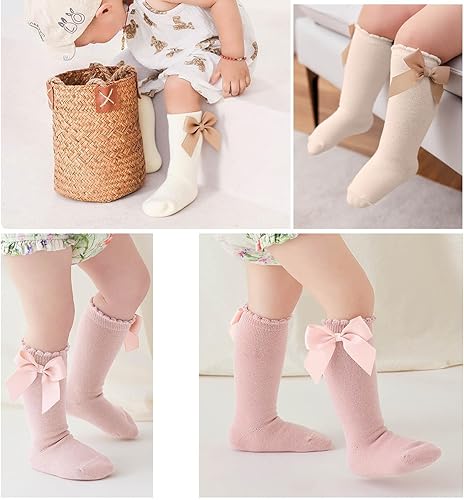 BQUBO Baby Knee High Socks Newborn Infant Toddler Kids Socks Girls Uniform Leggings Dress Sock Long Cotton Stockings(3 Pairs: White- Pink- Beige,6-12 Months)