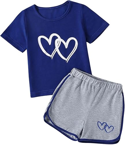 Floerns Toddler Girls 2 Piece Outfit Heart Print Short Sleeve Tee Shirt and Track Shorts Set(Dark Blue,8 Years)