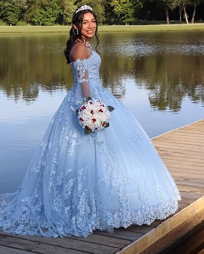 Strapless Tulle Quinceanera Dresses Detachable Long Sleeve Laces Appliques Formal Party Ball Gown for Women(Turquoise,2)
