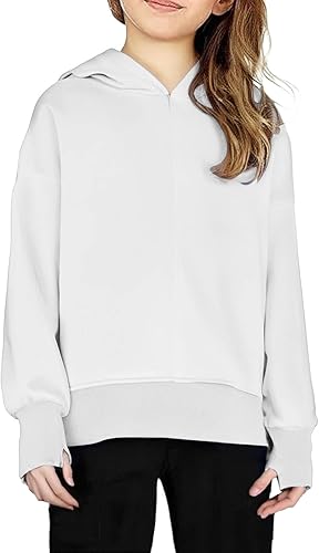 Girls Sweatshirt Hoodie Thumb Hole Long Sleeve Shirts Tunic Sweatshirts Slit Casual Loose Fall Clothes Outfits 2025(White,11-12 Years)