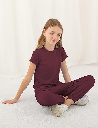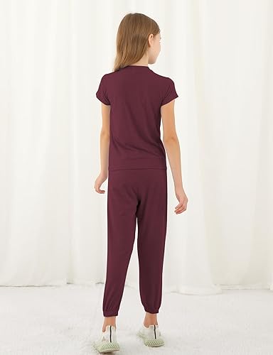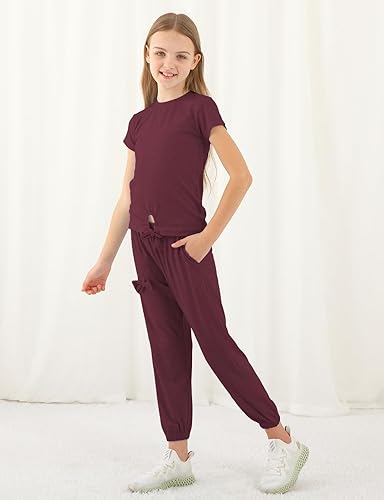 Girls pant Sets Stylish 2 Piece Outfits Short Sleeve Sweatshirt and Jogger Pants with Pockets for Kids(Dark Red,8-9 Years)