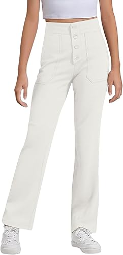 Girls School Uniform Chino Pants Stretchy Button Elastic Waist Pull on Dress Pants Straight Leg Twill Trousers 5-14 Years